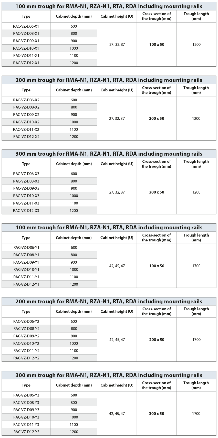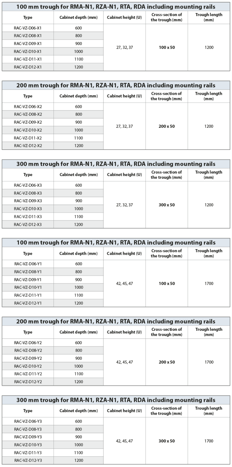 Vertical cable management wire trough including mounting rails for RMA-N1/RZA-N1/RTA/RYA/RDA free-standing cabinets in width of 800 mm. The wire troughs with a cross-section of 100/200/300×50 mm are designed for this purpose, the surface is galvanized. Trough lengths are 1200 mm for cabinet heights 27/32/37U and 1700 mm for cabinet heights 42/45/47U. The mounting profiles and brackets for fixing the wire trough are made of 1,3 mm thick steel sheet with a powder-coated finish. The set is designed for mounting on the depth of the cabinet, between the front and rear skeleton rail, in the area of the side cover. This makes efficient use of the space between 19“ rails and cabinet side walls.