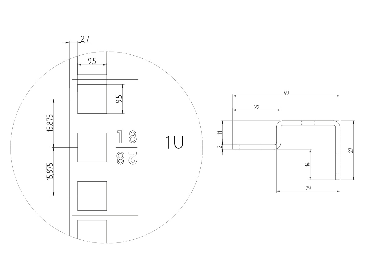Reinforced vertical rail for RDA, RDE cabinets. It is also installed in RXA cabinets with a width of 800 mm. Unit marking is done by punching.
