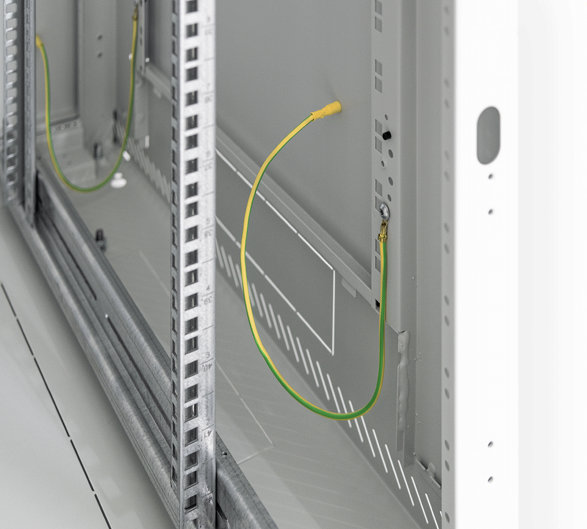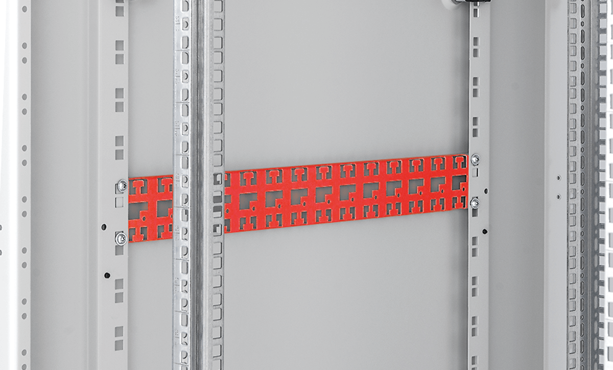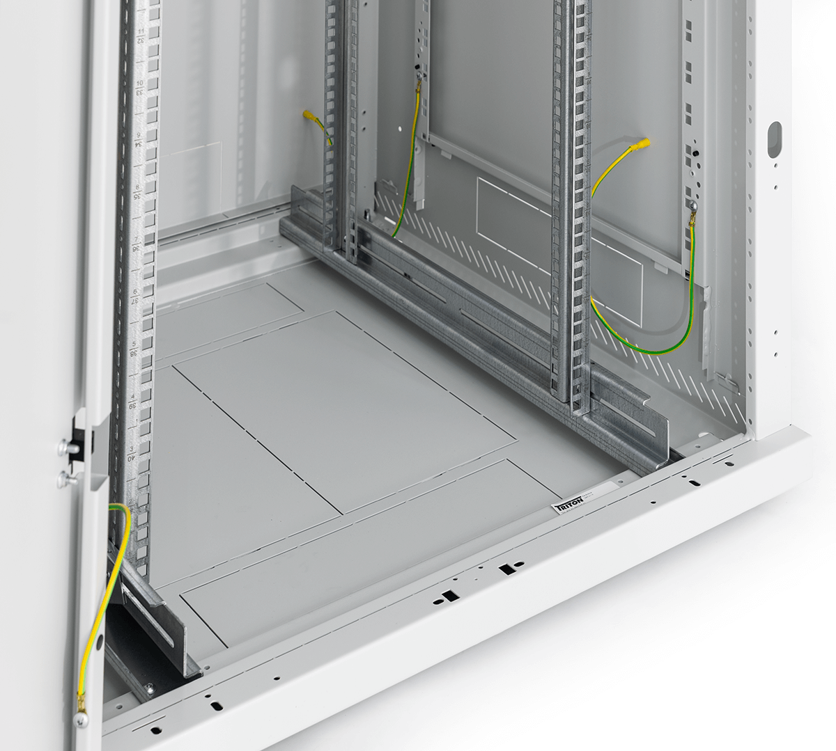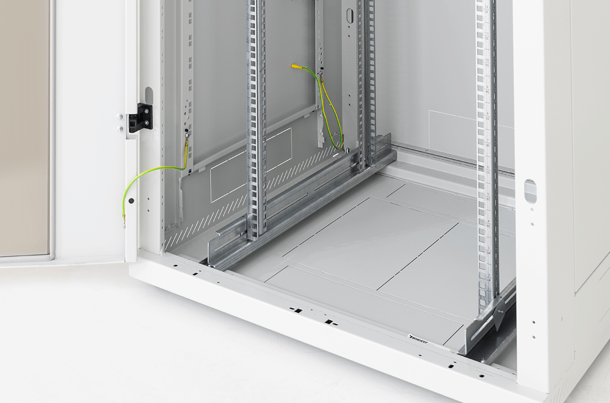 For enclosures deeper than 800 mm, a third pair of vertical rails for mounting the technology is supplied as standard. Thanks to their open profile, they do not restrict the installation of deeper equipment. Shorter devices can be mounted on the central vertical rail using different types of brackets (optional accessories).