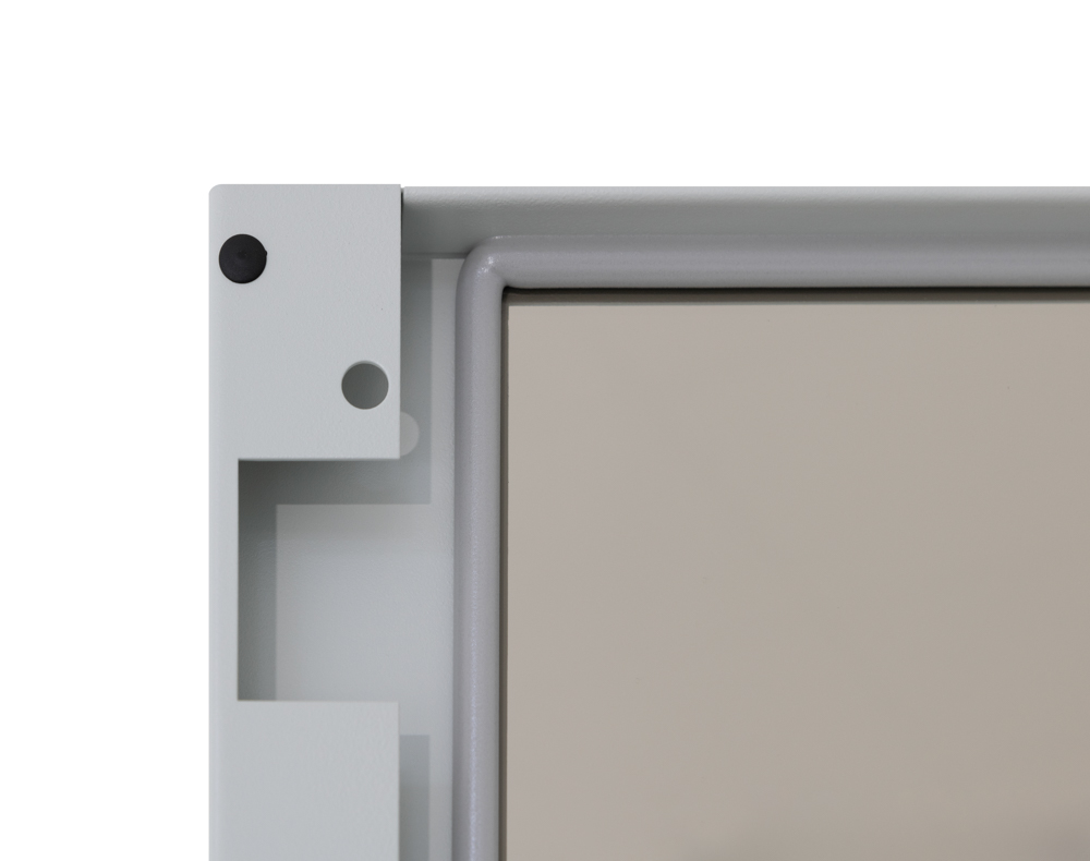 The frame is locked with two locks in a closed position. The distance of the swing frame from the cabinet door can be smoothly adjusted.